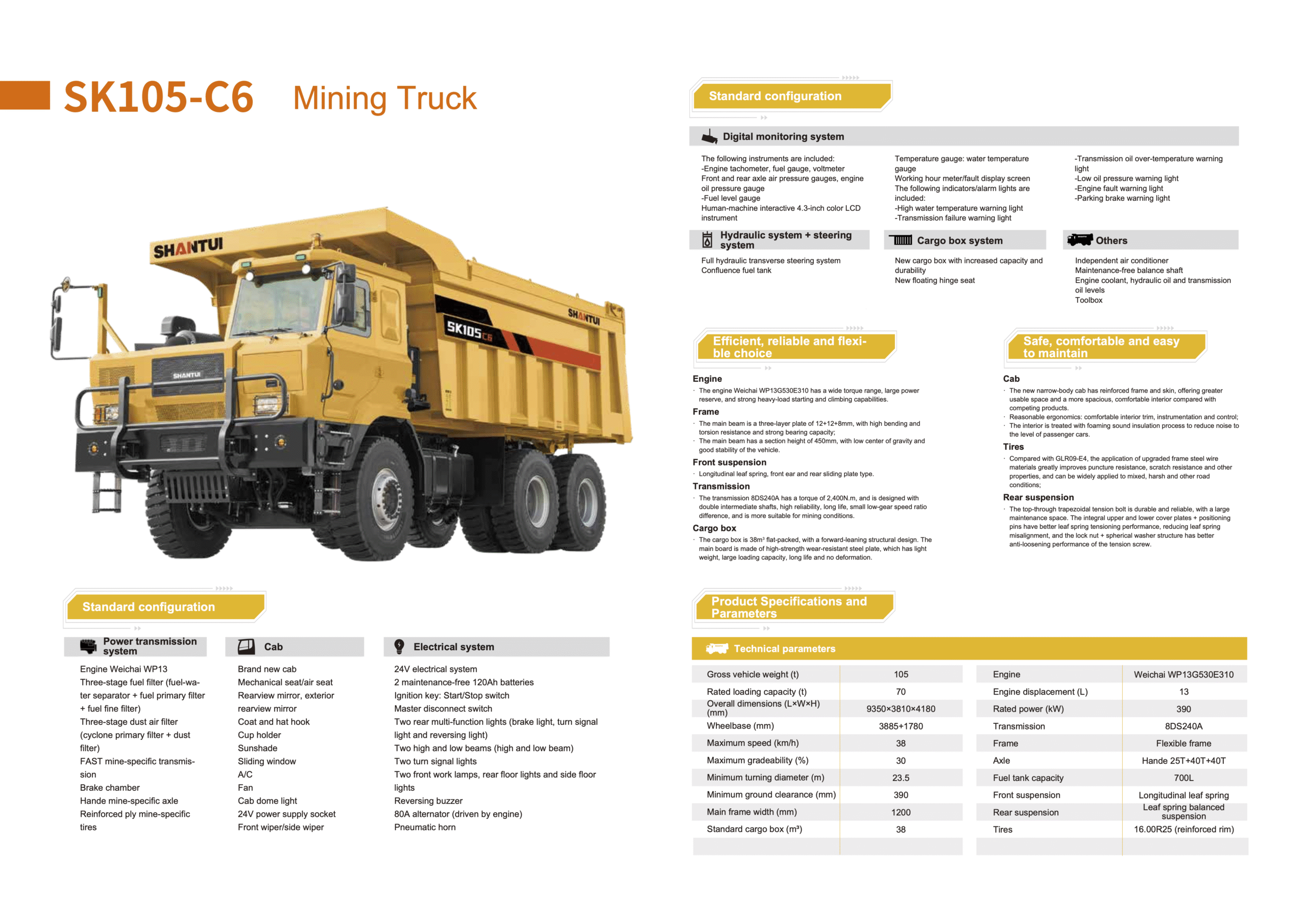 El Shantui SK105-C6 es un camión minero robusto, diseñado específicamente para ciclos de trabajo continuos y condiciones severas. Con una capacidad nominal de carga de 70 toneladas y un peso bruto de 105 toneladas, este equipo ofrece una solución altamente eficiente para minería, acarreo de materiales, obras de infraestructura pesada y movimientos de tierra de gran escala.